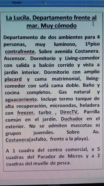 Departamento de dos ambientes para 4 personas, muy luminoso, 1ºpiso contrafrente. Sobre avenida Costanera. Ascensor. Dormitorio y Living-comedor con salida a balcón corrido y vista a jardín interior. Dormitorio con amplio placard y cama matrimonial, living-comedor con sofá cama doble. Baño y cocina completos. Gas natural y aguacorriente. Incluye termo tanque de alta recuperación, microondas, heladera con freezer, turbo , DirecTV, Parrilla común en el jardín. Duchador en el exterior. No se admiten mascotas ni grupos juveniles.
