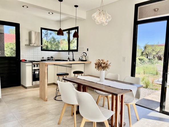 90 mts. cubiertos en dos plantas, en planta baja living comedor y cocina totalmente equipada. Cocina con horno. Heladera con freezer. Pava eléctrica, vajilla completa.