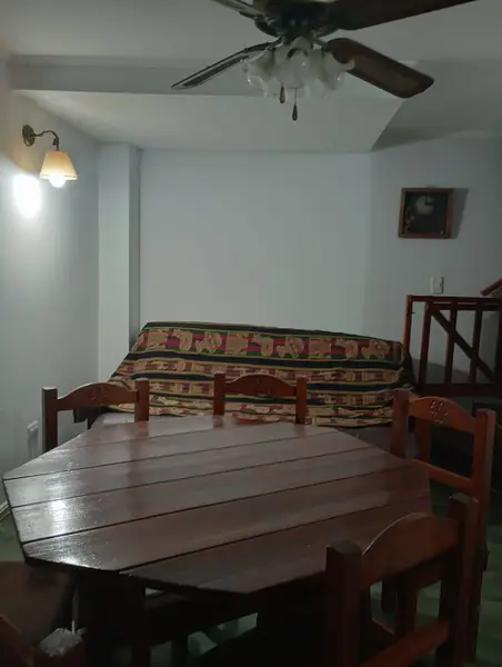 Av. Tucumán 1668. Dúplex 4. San Bernardo. Futon cama dos plazas en living, tv, cable. P. Alta Dormitorio matrimonial c/tv, cable. Dormitorio 2 camas cucheta. 1 baño principal c/bañera, 1 toilete. Calefacción. Ventiladores de techo en todos los ambientes. Heladera c/freezer. Microondas. Lavadero, lavarropas. Patio, parrilla, c/ mesa y 4 sillas.