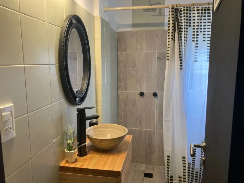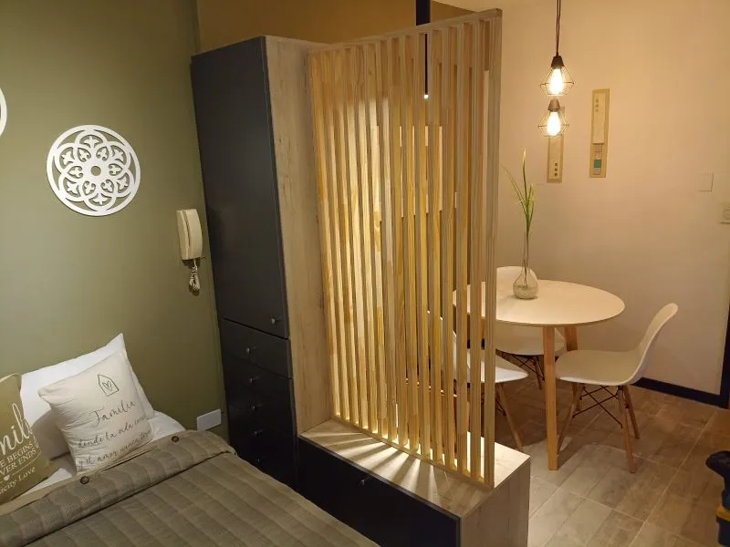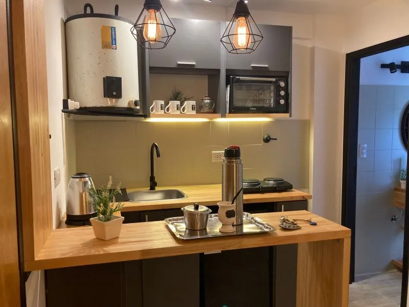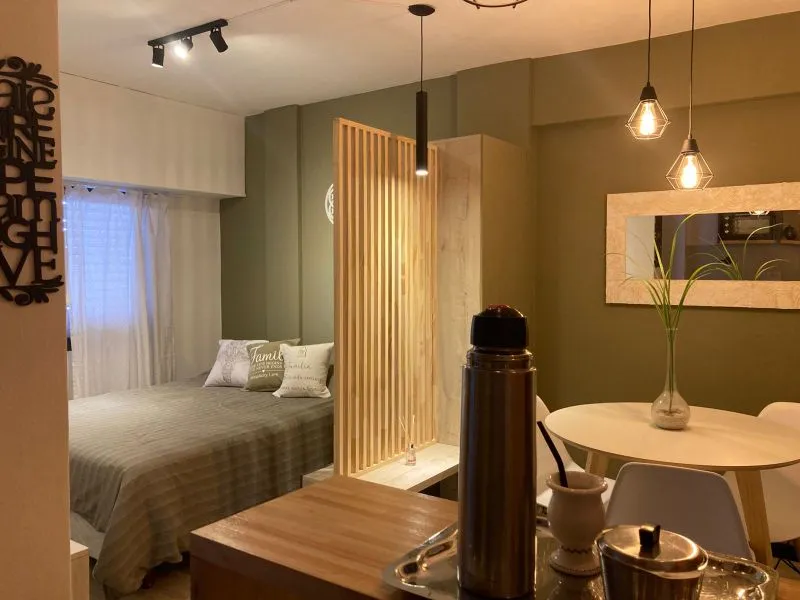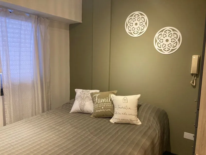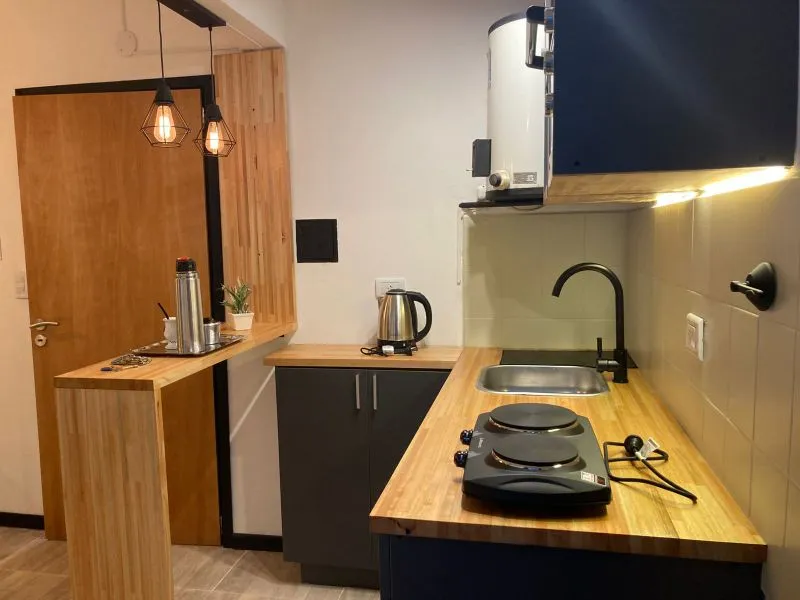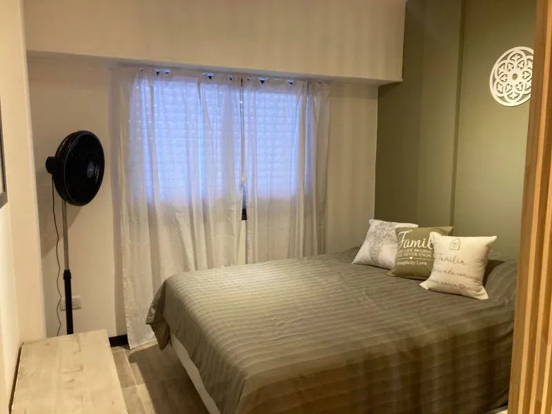 Departamento 1 ambiente reciclado en edificio "San Jorge", ubicado en la esquina de calle 3 y 1, en plena calle comercial (peatonal) y una cuadra de la playa. Moderno departamento monoambiente. La cocina integrada, con una cómoda barra de madera, está completamente equipada con anafe y horno eléctrico, alacena y bajo mesada, ideal para tus vacaciones con cable y wifi (prepago)