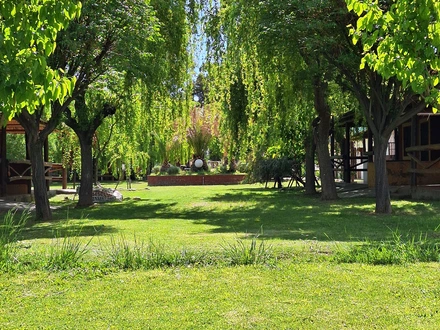 Hermoso lugar para descansar y disfrutar en familia o con amigos , parque totalmente parquizado de 2 hectáreas con vista a las montañas , a solo 10minutos del valle grande , río del atuel . cuenta con una pileta de 6mts x 13 mts , con cabañas para seis personas , totalmente equipadas , baño y ant...